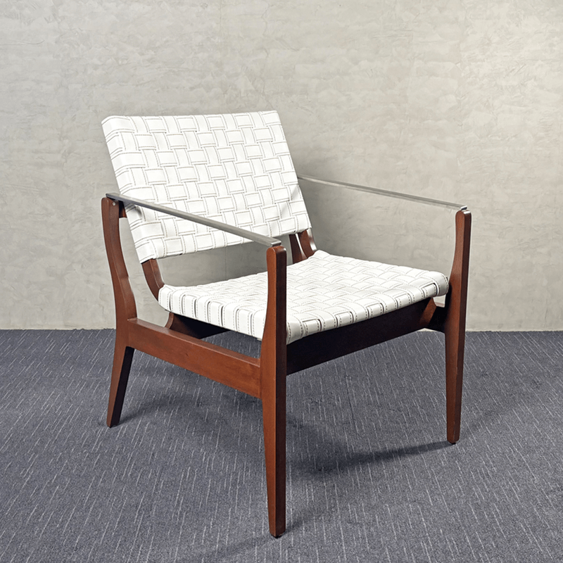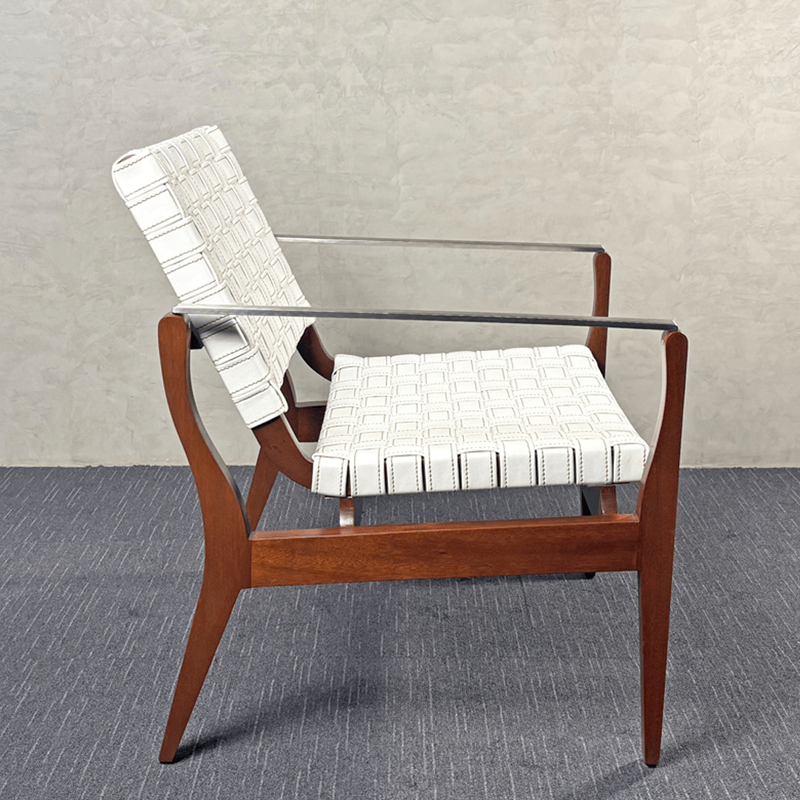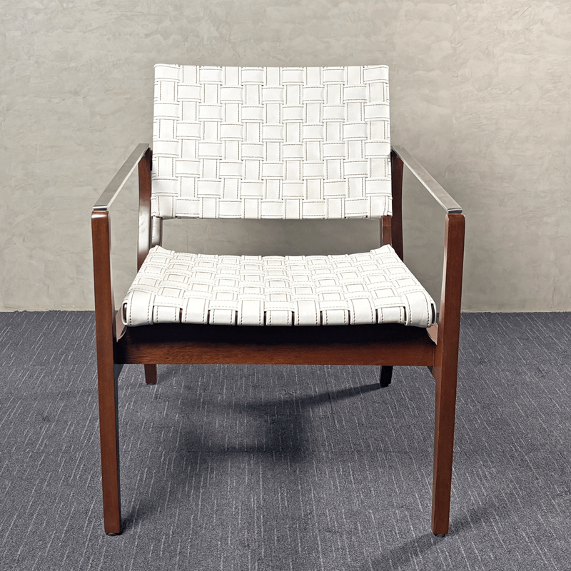 Artfully crafted with faux leather over a Philippine mahogany wood frame, our Corey woven armchair features a manually stitched leather strap seat and backrest, suitable for any living, bedroom or office space.